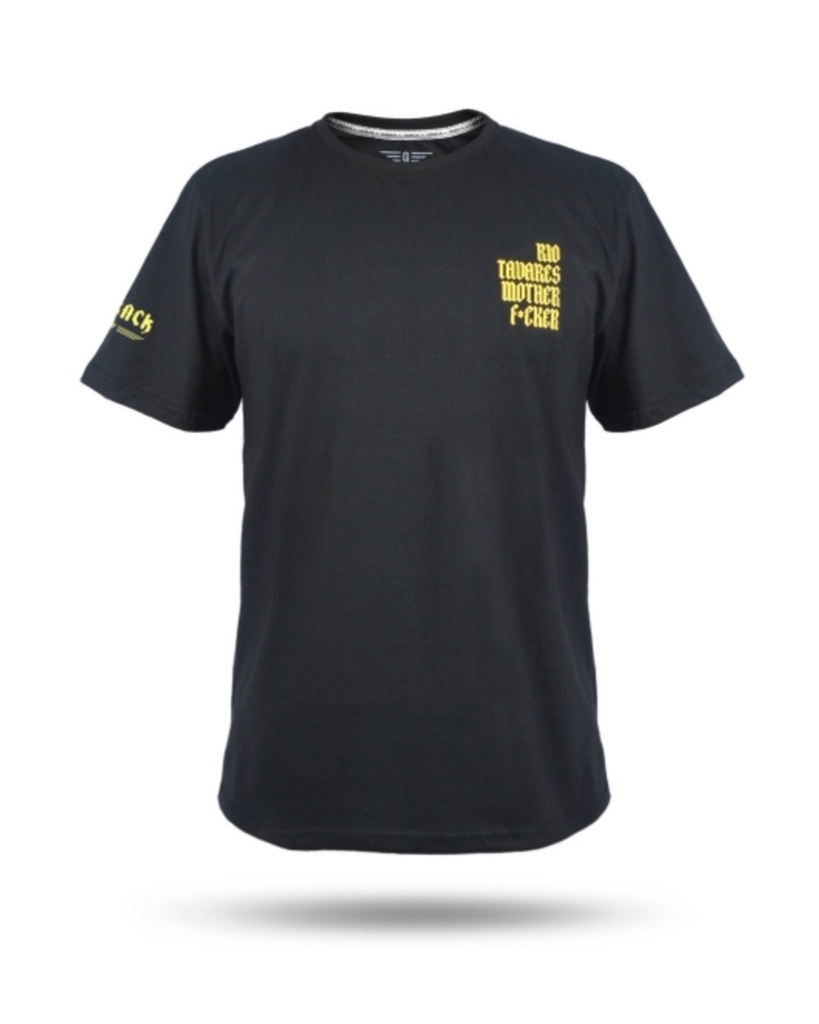 Peça Preta 100% algodão com gola fechada, silk amarelo a base d'água no peito e costas e etiqueta de alta definição na manga.