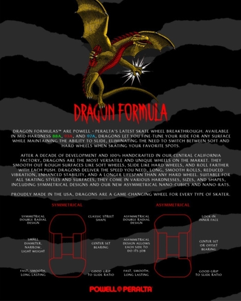 Sobre a Dragon Formula: O incrível novo uretano Dragon Formula™ (DF) usado para criar essas rodas é outra inovação líder do setor da Powell • Peralta. Os Dragões DF-93A não apenas rolarão em terrenos acidentados, mas também agarrarão e deslizarão como as rodas 99A e 101A fazem, para que você possa fazer todos os seus truques normais e muito mais na maior variedade de terrenos de skate tornados skatáveis por sua dureza 93A mais suave.