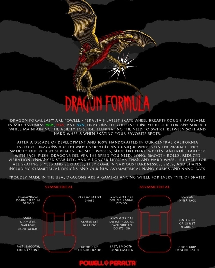 Sobre a Dragon Formula: O incrível novo uretano Dragon Formula™ (DF) usado para criar essas rodas é outra inovação líder do setor da Powell • Peralta. Os Dragões DF-93A não apenas rolarão em terrenos acidentados, mas também agarrarão e deslizarão como as rodas 99A e 101A fazem, para que você possa fazer todos os seus truques normais e muito mais na maior variedade de terrenos de skate tornados skatáveis por sua dureza 93A mais suave.